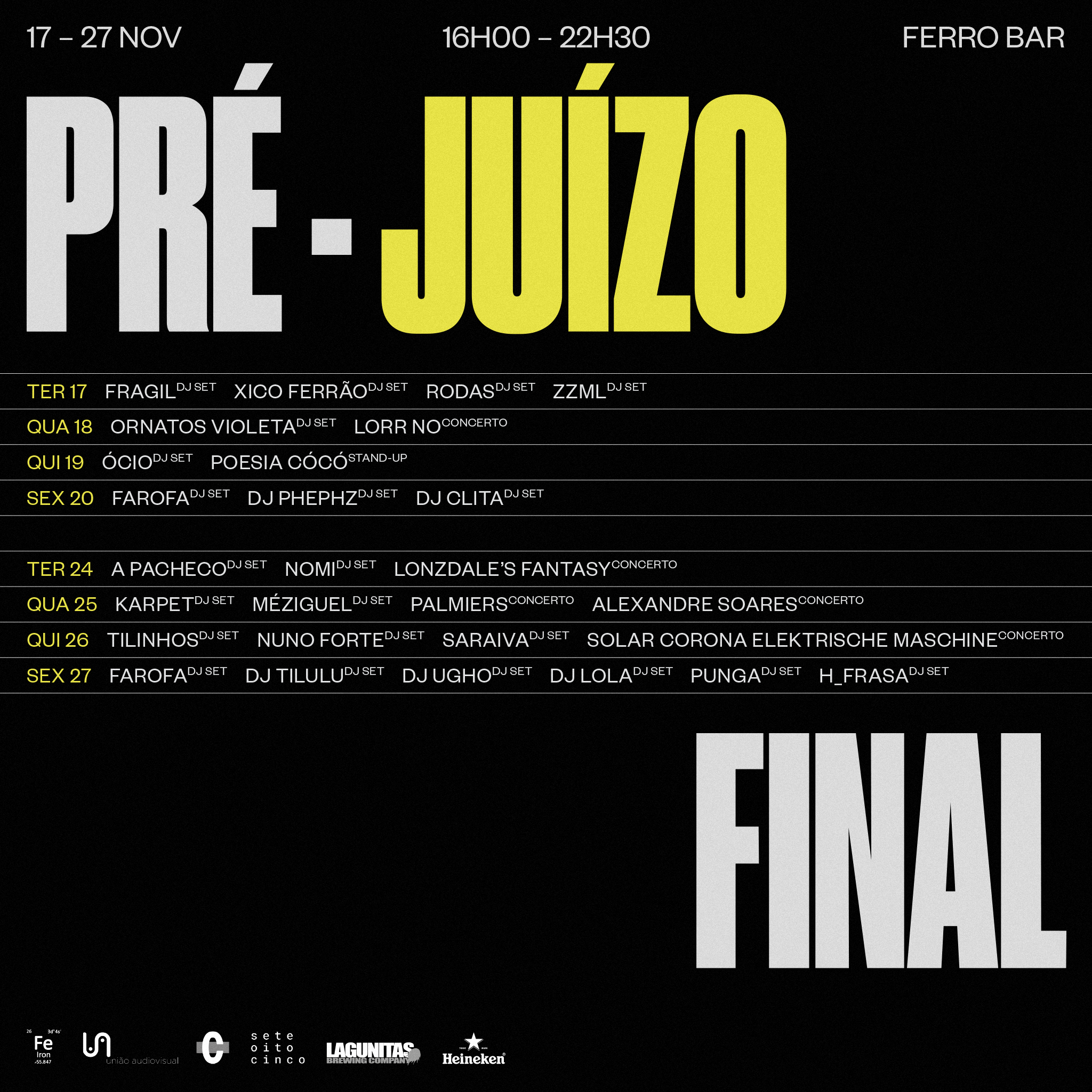 Pré-Juízo Final são sessões de ocupações artísticas e musicais a decorrer no Ferro Bar, durante as próximas duas últimas semanas de novembro, nos dias 17 a 20 e ainda nos dias 24 a 27.